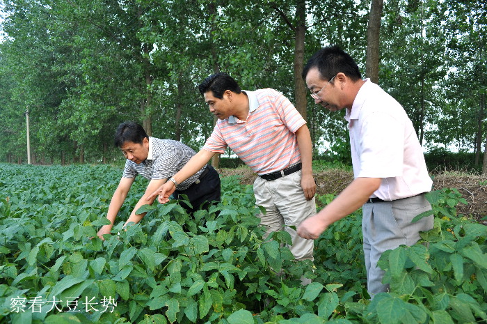 八月的潘村湖农场,满目葱茏,生机盎然,3.2万亩大田里,大豆、水稻、玉米等秋季作物孕育着丰收的希望。在黑板桥头,王占廷走进一块大豆田,仔细察看庄稼长势,柏华胜场长介绍说,今年是潘村湖农场实行大豆统一供种的第2年,由于种子质量上乘,加之最近两个月当地雨水丰沛,全场在地作物长势良好,但个别地块也还有因群体过大而影响结荚数的情况。王占廷拨开身旁茂盛的豆棵,细细察看结荚情况,高兴地说,这块地的大豆结荚数还不错,而且没发现什么病虫害。农场党委书记林贤传汇报道,今年职工家庭农场防治大豆病虫害的积极性很高,同时由于近阶段降水频繁、雨量较大,在一定程度上抑制了地下害虫对大豆的危害。