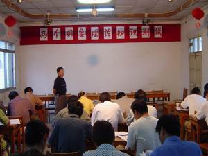 8月5日上午,龙亢农场党委组织全场各党总支、支 部书记及副科以上干部近40人参加两个<<纲要>>理 论知识测试。经批阅,参试人员的平均分达98.25 分。(图为考试现场)