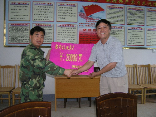 在建军80周年到来之际,为表达全场干部职工对前来支援淮河抗洪抢险战斗的人民子弟兵的敬意,潘村湖农场党委书记、场长韩大鸣,副场长陶卫东率场有部门同志于7月23日上午冒雨来到73092部队潘村驻地,看望慰问了全体指战员,并送去慰问金20000元。